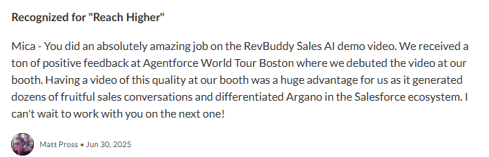Argano se asoció con un distribuidor líder de paneles solares para mostrar cómo las tecnologías de Salesforce pueden transformar las operaciones de ingresos y la compensación de incentivos. El objetivo era crear un video dinámico y apto para eventos que demostrara claramente el poder de Agentforce, Salesforce Revenue Cloud Advanced, Einstein, Data Cloud y Salesforce Spiff mediante imágenes atractivas, una narrativa concisa y un diseño accesible.